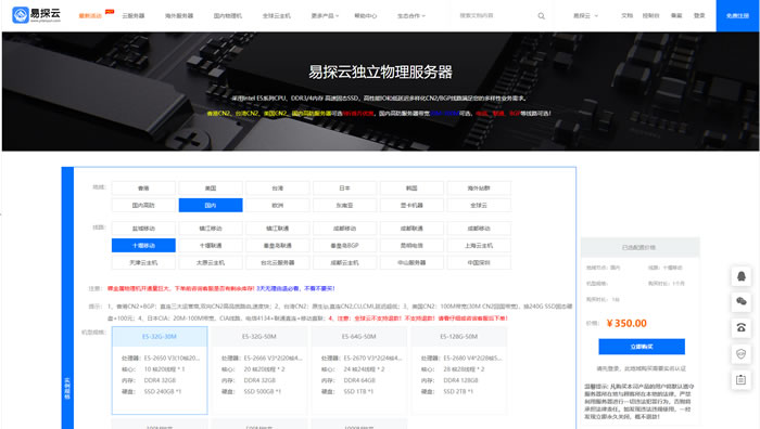 易探云国内移动服务器怎么样?易探云国内移动服务器提供十堰、盐城、镇江、成都、宁波、驻马店等多地机房选择,月付价格低至350元起。其核心优势在于采用中国移动直连线路,为移动用户带来极低的延迟和畅快体验,并普遍配备100G以上高防能力,有效抵御DDoS攻击,保障业务安全稳定。服务器提供50M起独享带宽和独享计算资源,性能强劲可靠。易探云(yitanyun.cn)移动服务器以“移动直连+高防+独享”为特色,兼具卓越性价比,特别适合主要用户为移动群体、需高防御预算有限的游戏、APP、企业官网等应用场景,是低成本部署国内业务的优质选择。 点击进入:易探云官方网站地址 一、易探云国内移动服务器的核心优势 易探云的移动服务器之所以有市场,主要源于以下几个突出优势: 1、网络线路优势:中国移动直连 对移动用户极佳: 服务器直接接入中国移动的核心骨干网络。这意味着国内使用中国移动宽带的用户访问时,延迟极低、速度非常快,体验流畅。 三网优化: 虽然主打移动线路,但易探云通常会为这些服务器提供“三网回程”或“BGP中转”优化。即电信和联通的用户访问时,会通过优化的路由接入移动网络,相比纯粹的“移动单线”,跨网访问速度要好很多,避免了传统移动线路“围墙花园”的问题。 2、高防御能力(高防) 这是移动服务器最大的亮点之一。易探云在盐城、镇江、宁波等节点提供的移动服务器,通常默认就带有较高的DDoS防御值,从几十G到数百G不等。 对于易受攻击的业务(如游戏、金融、电商、企业官网等),无需额外购买昂贵的高防服务,本身就具备一定的抗攻击能力,性价比极高。 3、性价比高 相比于BGP多线服务器或电信线路服务器,同等配置下,移动线路的服务器价格通常更低。这对于预算有限,但又需要国内服务器低延迟和稳定性的用户来说,非常有吸引力。 正如广告语中提到的“低至350元/月起”,这个价格在BGP或电信线路中很难找到同等配置。 4、资源独享 易探云提供的这个价位的移动服务器通常是独立服务器(物理机)或独享CPU/带宽的云服务器。这意味着CPU、内存、带宽和防御资源都是您独享的,不会受同一台母机上其他用户的影响,性能更加稳定。 5、多地可选,满足不同需求 提供十堰、盐城、镇江、成都、宁波、驻马店等多个地域,用户可以根据自己目标用户群体的地理位置选择最近的节点,以进一步降低网络延迟。